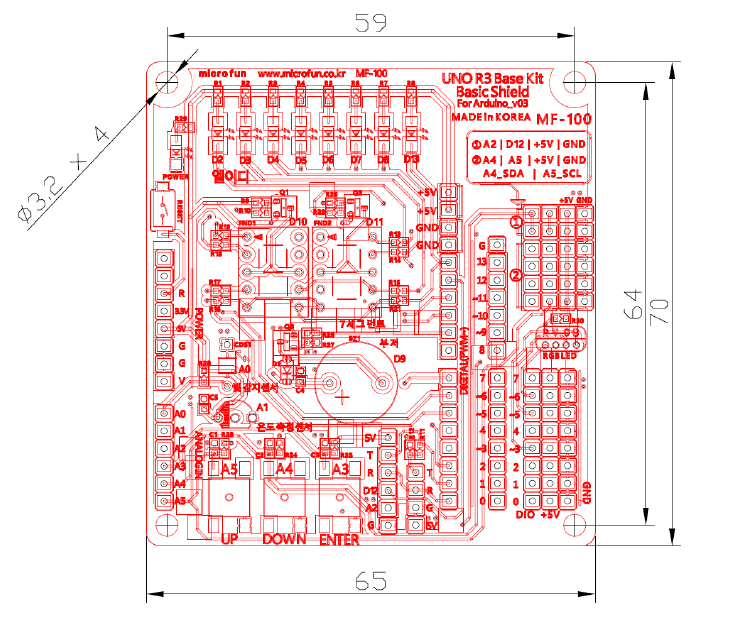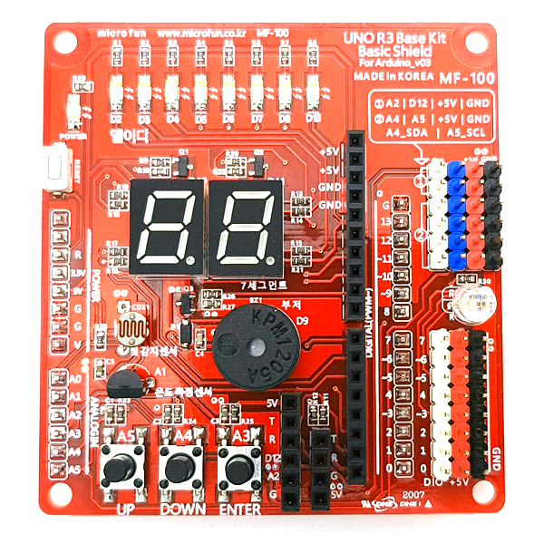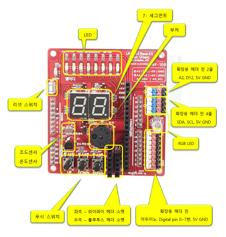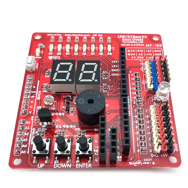 이 제품은 여러가지의 입출력 부품들을 모아 하나의 아두이노 쉴드로 구성한 제품입니다.